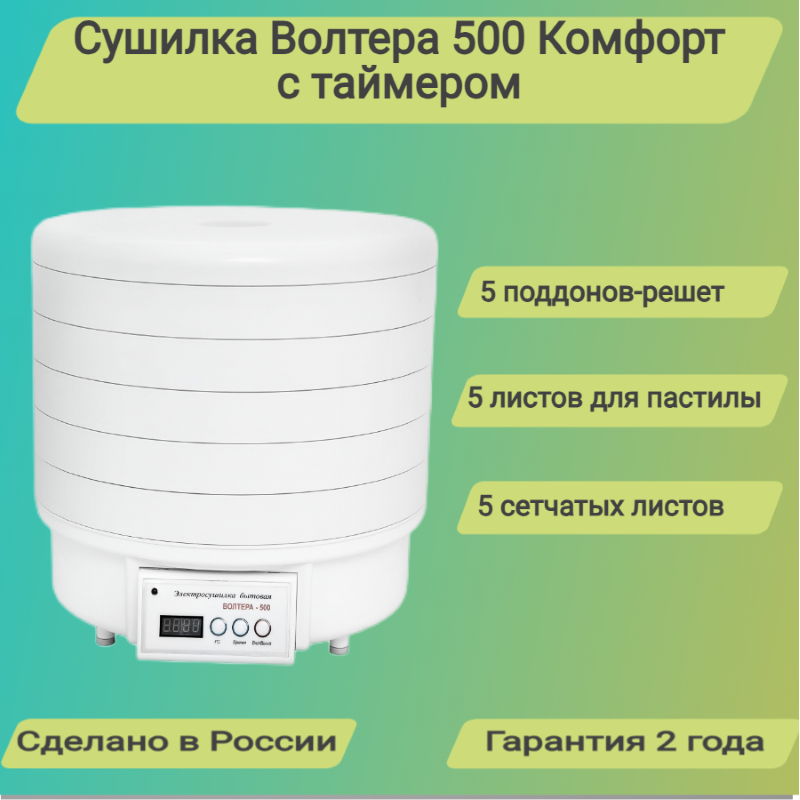 Сушилка Волтера 500 Комфорт с таймером.Комплект:5 поддонов+5 листов для пастилы+5 сетчатых листов