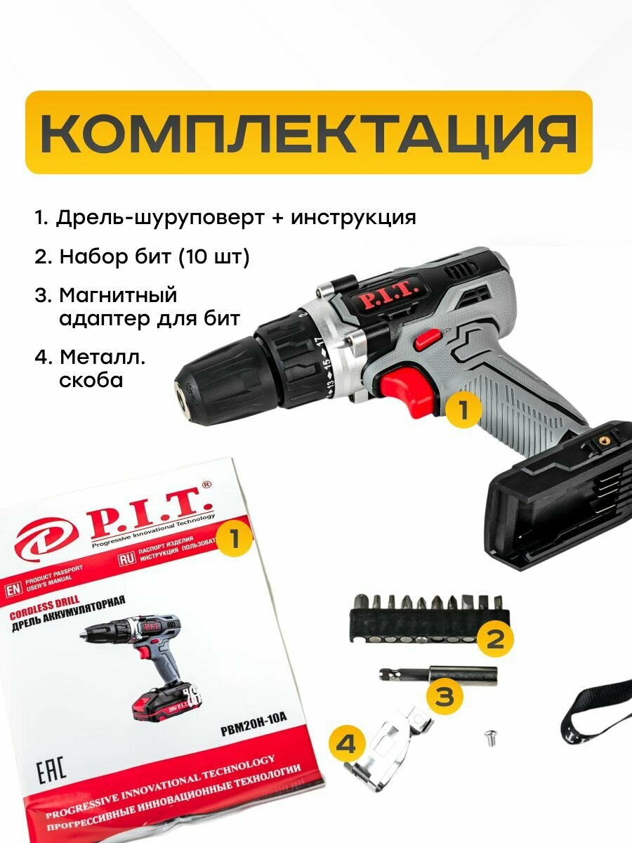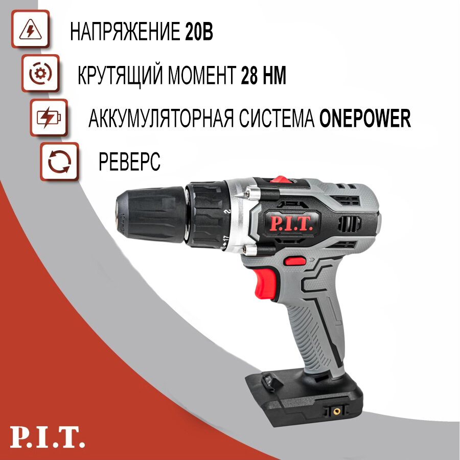 Дрель-шуруповерт аккумуляторная P.I.T. PBM20H-10A COMBO, 20В, 28Нм, АКБ в подарок без ЗУ