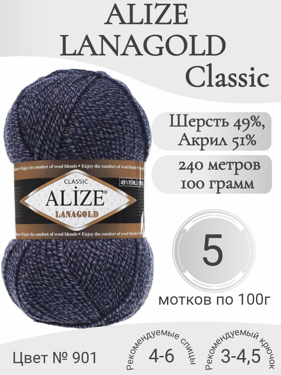 Пряжа для вязания ALIZE 'Lanagold', 100г, 240м (49% шерсть, 51% акрил) (203 джинса), 5 мотков