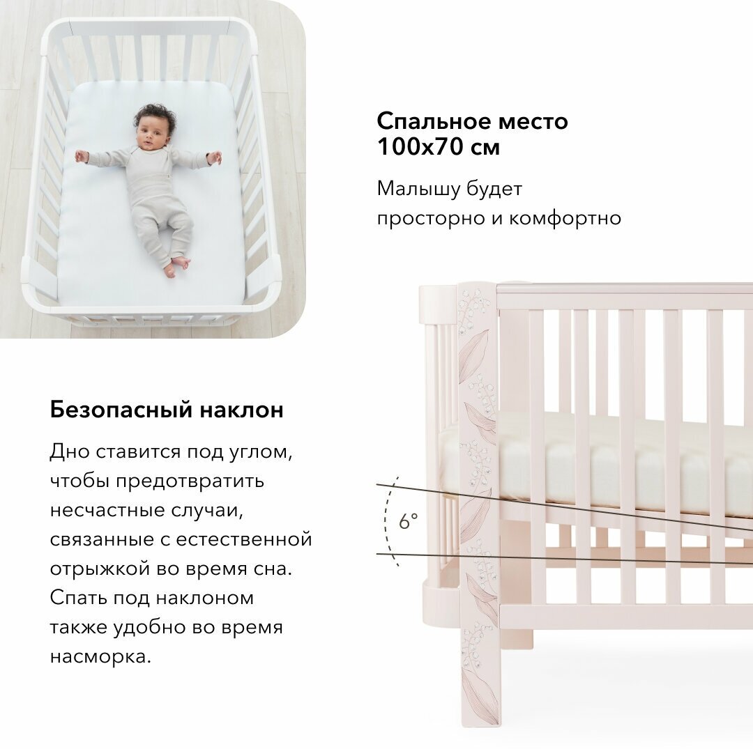 Сохранить95024, Кроватка для новорожденных трансформер 0-5 лет, Happy Baby MOMMY LOVE, массив дерева, люлька-кроватка, колёса, маятник, розовая с ландышами интересное: