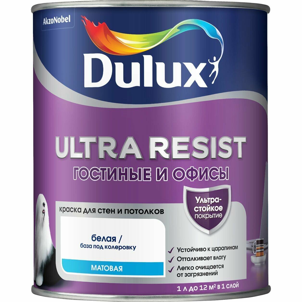 DULUX ULTRA RESIST гостиные И офисы краска интерьерная, усилена воском, матовая, база BW (1л)