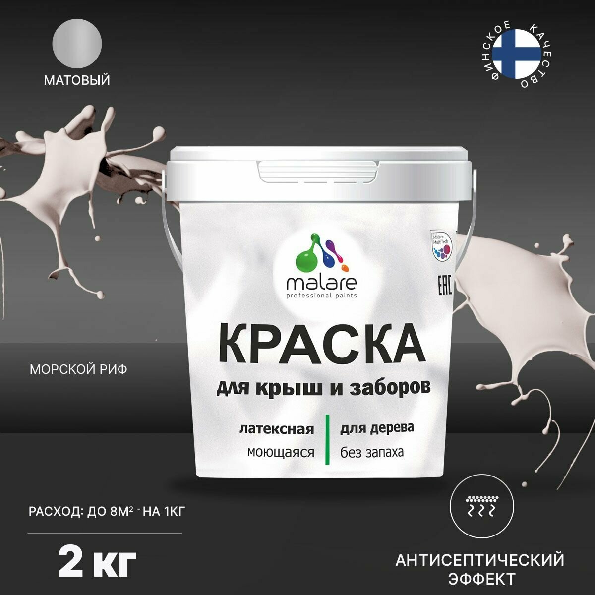 Краска Malare для деревянного забора, для крыши из шифера, для деревянных и минеральных поверхностей, с антисептическим эффектом, быстросохнущая, без запаха, матовая, парное молоко, 2 кг.