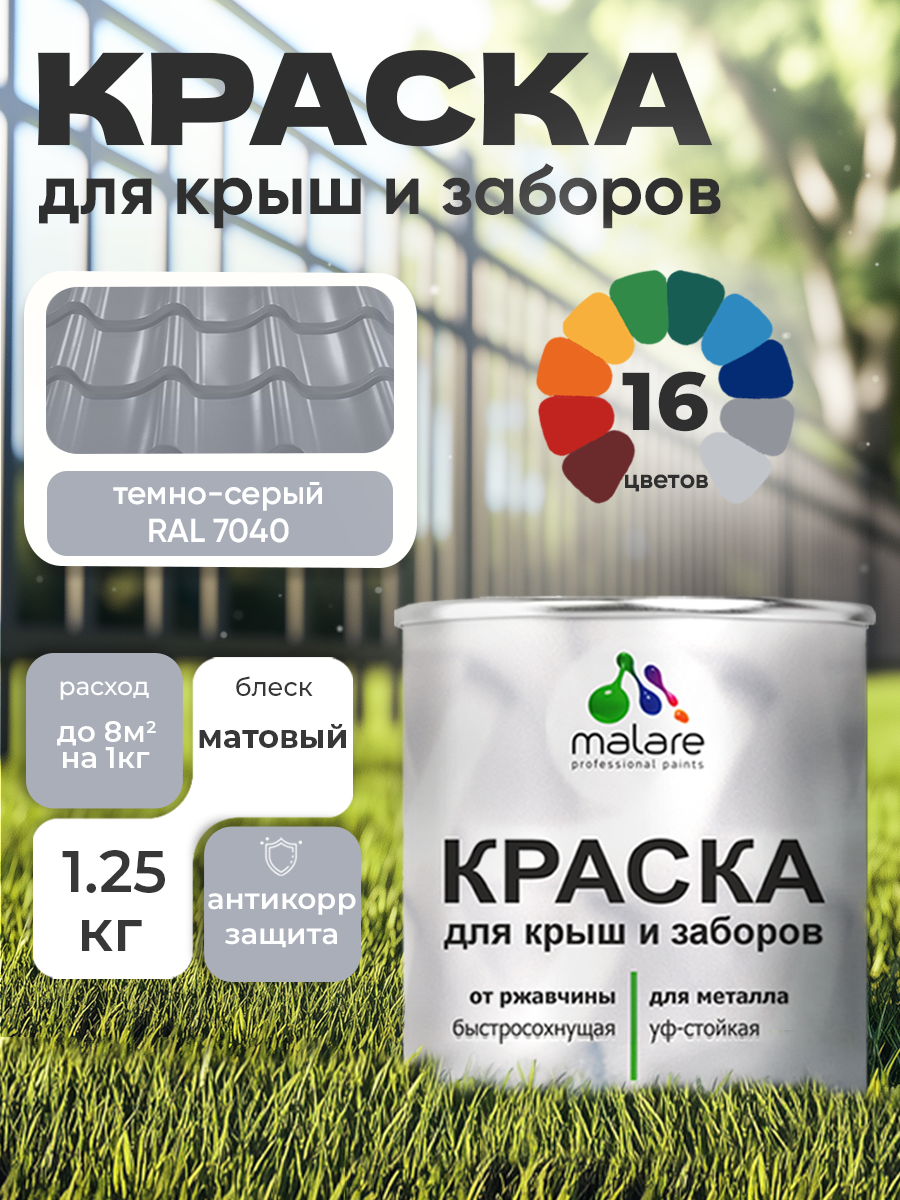 Купить Краска Malare для металлического забора, для крыши из металла, для металлочерепицы, антикоррозионная, матовый, темно-серый, 1,25 кг.