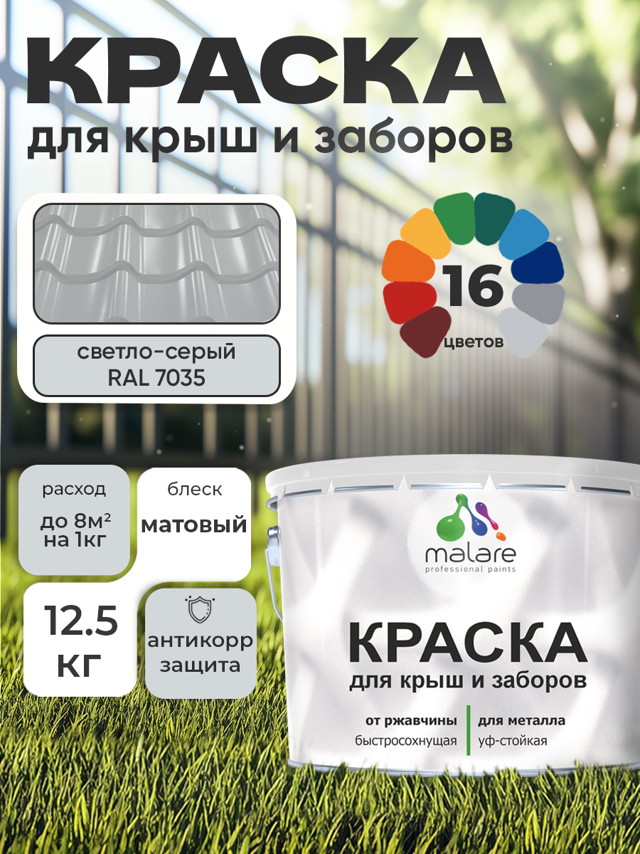 Купить Краска Malare для металлического забора, для крыши из металла, для металлочерепицы, антикоррозионная, матовый, светло-серый, 12,5 кг.