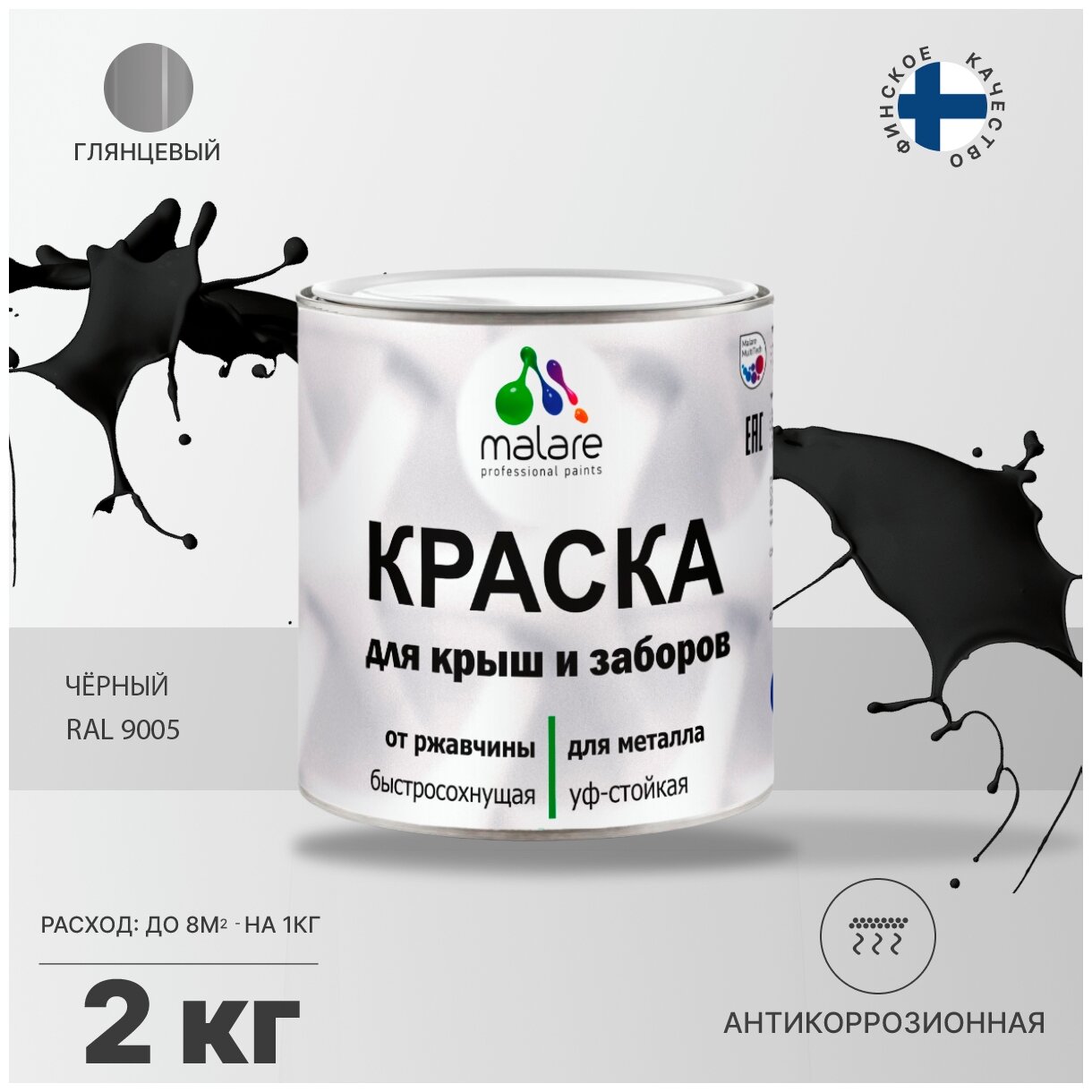 Купить Краска Malare для металлического забора, для крыши из металла, для металлочерепицы, антикоррозионная, глянцевый, черный, 2 кг.