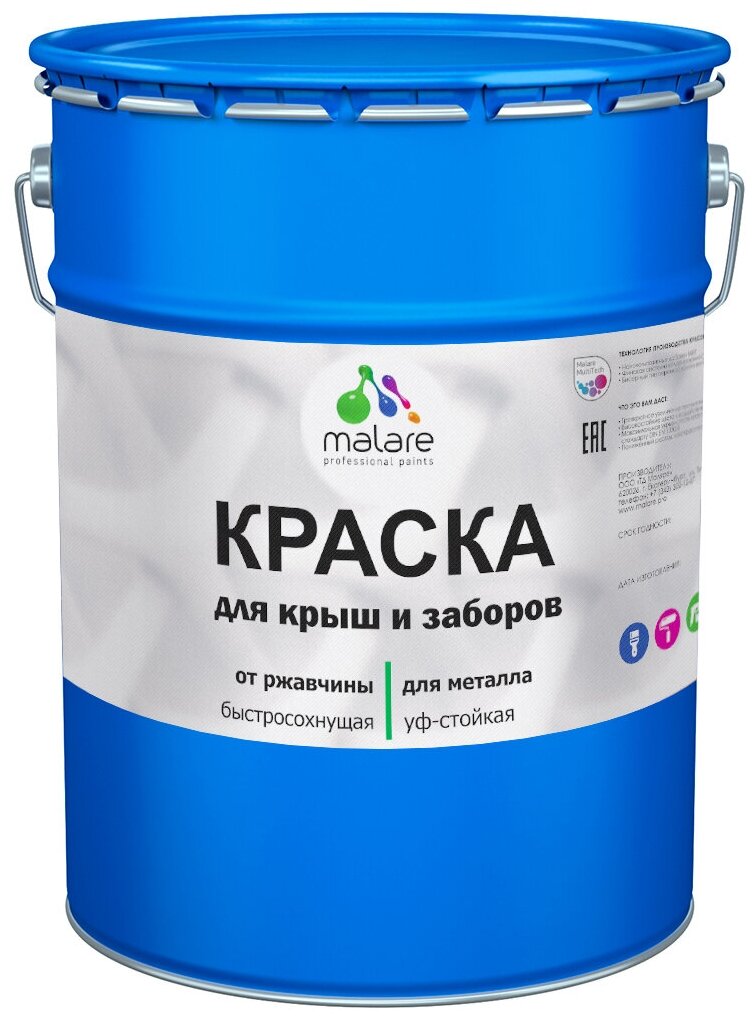 Краска Malare для металлического забора, для крыши из металла, для металлочерепицы, антикоррозионная, глянцевый, синий, 18 кг.