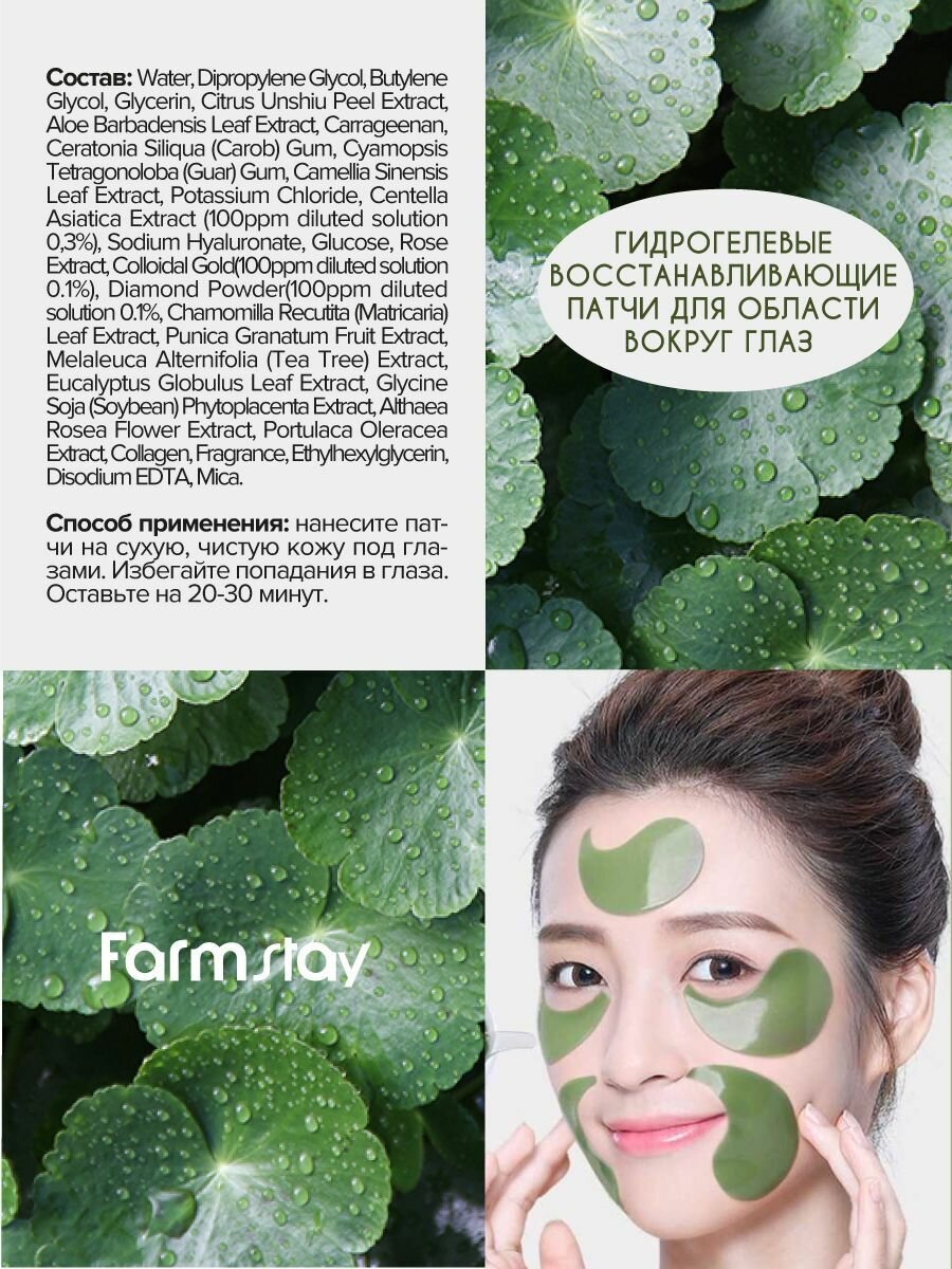 FarmStay Гидрогелевые восстанавливающие патчи для области вокруг глаз с центеллой азиатской, 60 шт, FarmStay