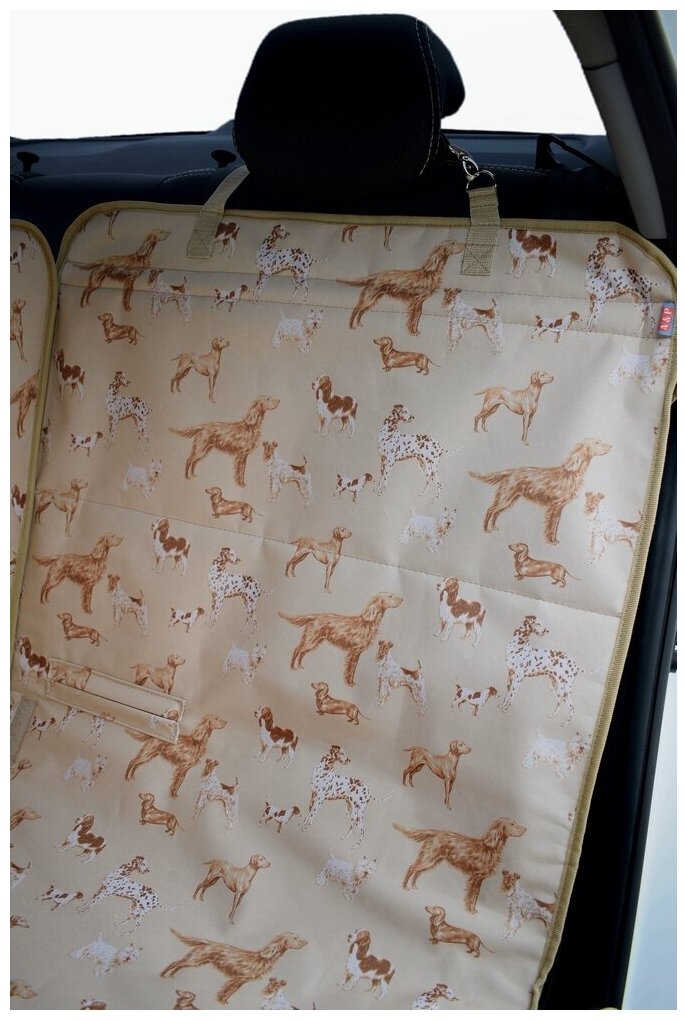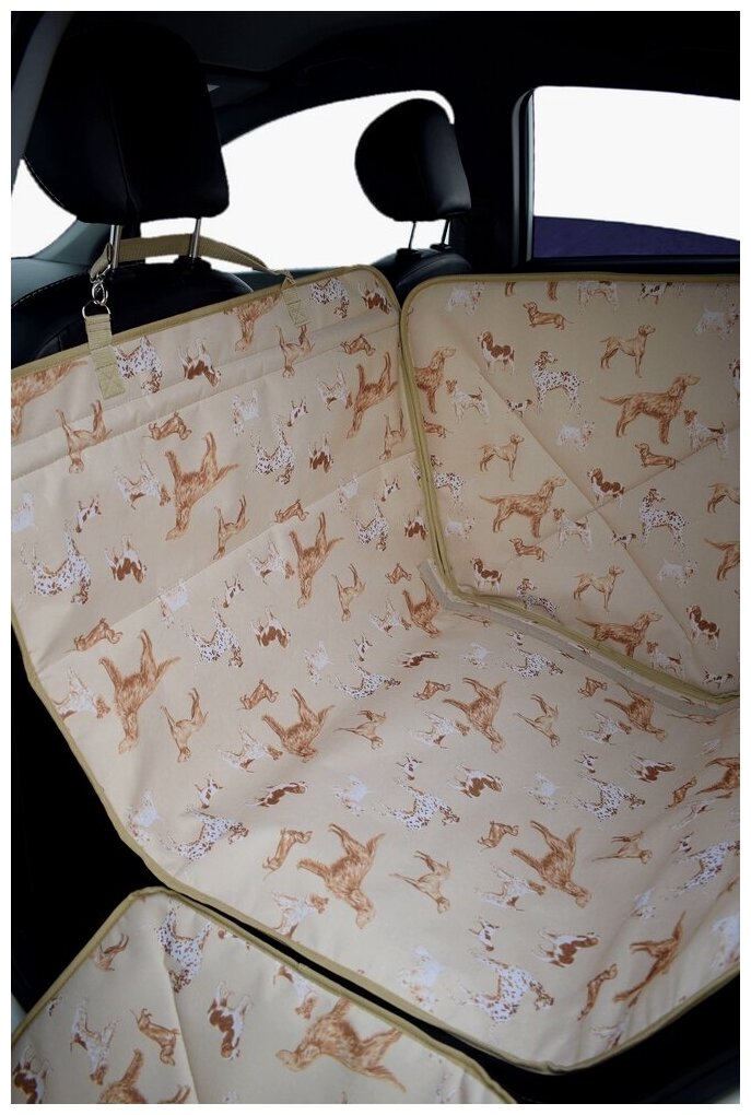 Автогамак для перевозки собак Happy Dog (Хэппи Дог). На половину заднего сиденья. Цвет: собаки на бежевом фоне.