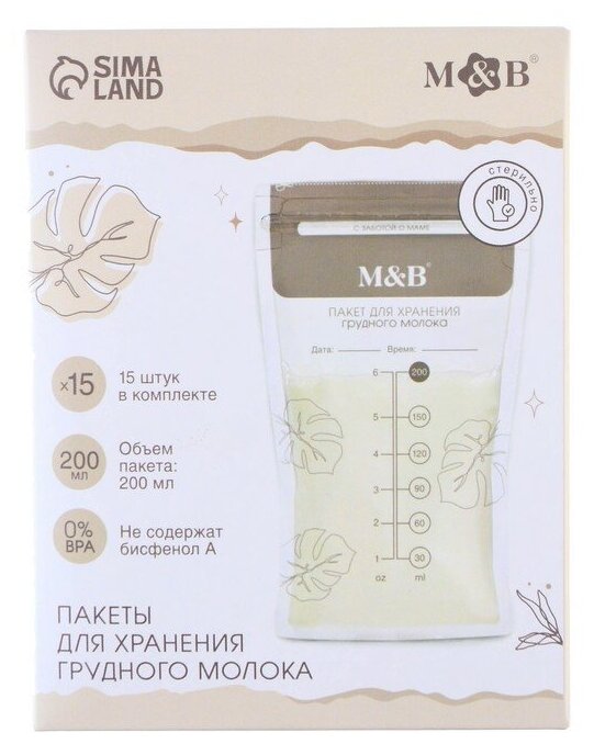 Пакеты для хранения и заморозки грудного молока M&B, 200 мл, набор 15 шт.
