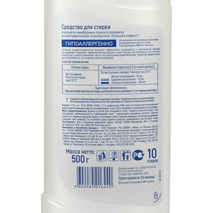 Жидкое средство для стирки "Большая стирка", гель, для пуховиков, гипоаллергенно, 500 мл./В упаковке шт: 1 интересное: