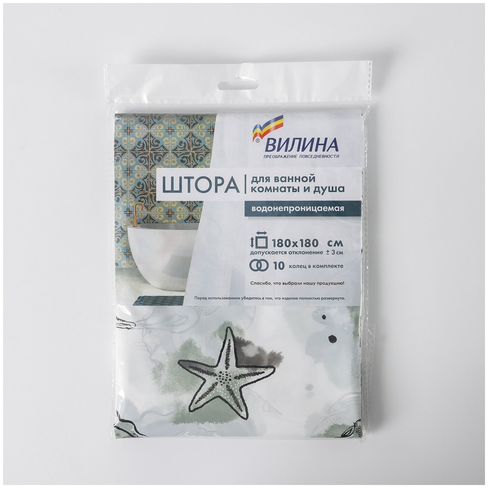 Штора для ванной комнаты VILINA водонепроницаемая с рисунком занавес с кольцами 180х180 см Ракушки белая