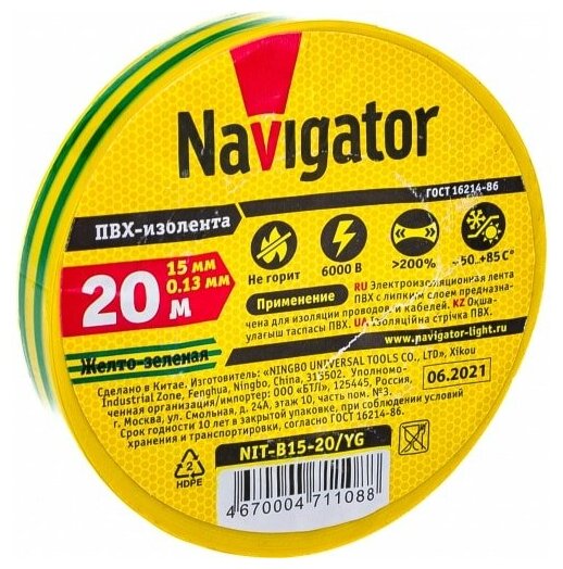 Купить NAVIGATOR Изолента ПВХ 15мм (рул.20м) жел/зел. NIT-B15-20/YG Navigator 71108