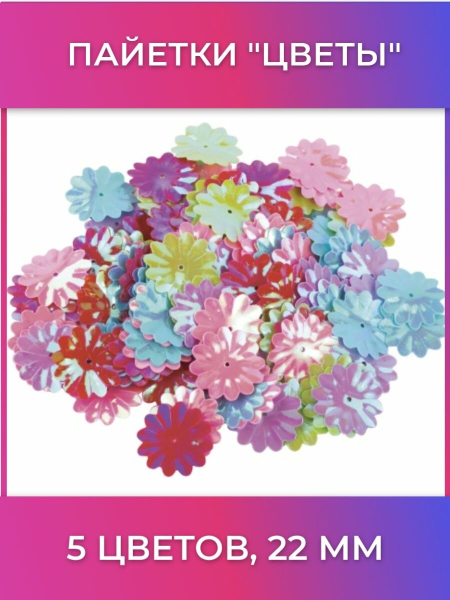 Пайетки для творчества "Цветы", яркие, цвет ассорти, 5 цветов, 22 мм, 20 грамм, остров сокровищ, 661286 В комплекте: 5шт.
