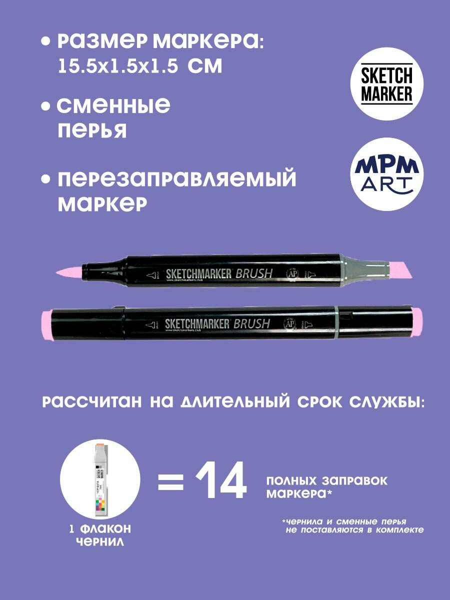 СохранитьДвусторонний заправляемый маркер SKETCHMARKER Brush Pro на спиртовой основе для скетчинга, цвет: V104 Розовая лаванда интересное: