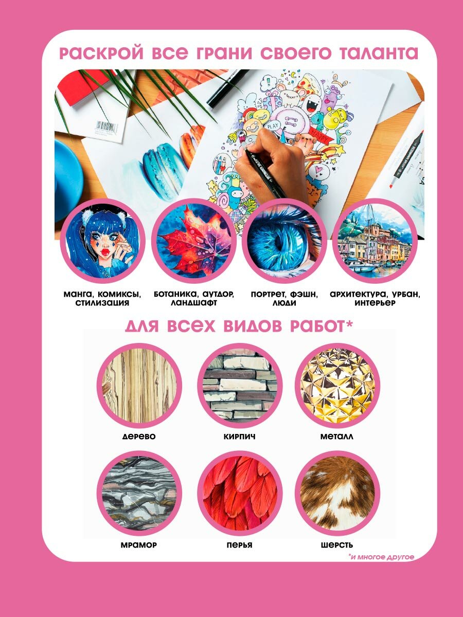 | Отзыв: | В целом маркеры понравились, буду расширять палитру. Корпус тонкий, на любителя, моей руке подходит и в сумке с другими маркерами занимает меньше места. Наконечники позволяют делать красивые акварельные переходы и эффекты. При заливке немного полосят и дают растяжку, но это не столько недостаток сколько особенность. Кисть износостойкая, в сравнении с кистью Copic и Touch более тонкая и мягкая. Своих денег стоит однозначно.