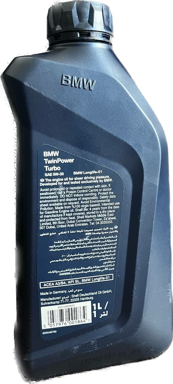 BMW 83212465843 Масло моторное синтетическое TWIN POWER TURBO 5W30 API SL, ACEA A3/B4 1л