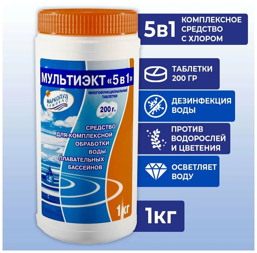 Маркопул Кемиклс Дезинфицирующее средство "Мультиэкт 5 в 1", для воды в бассейне, комплексный препарат, таблетки 200 г, 1 кг
