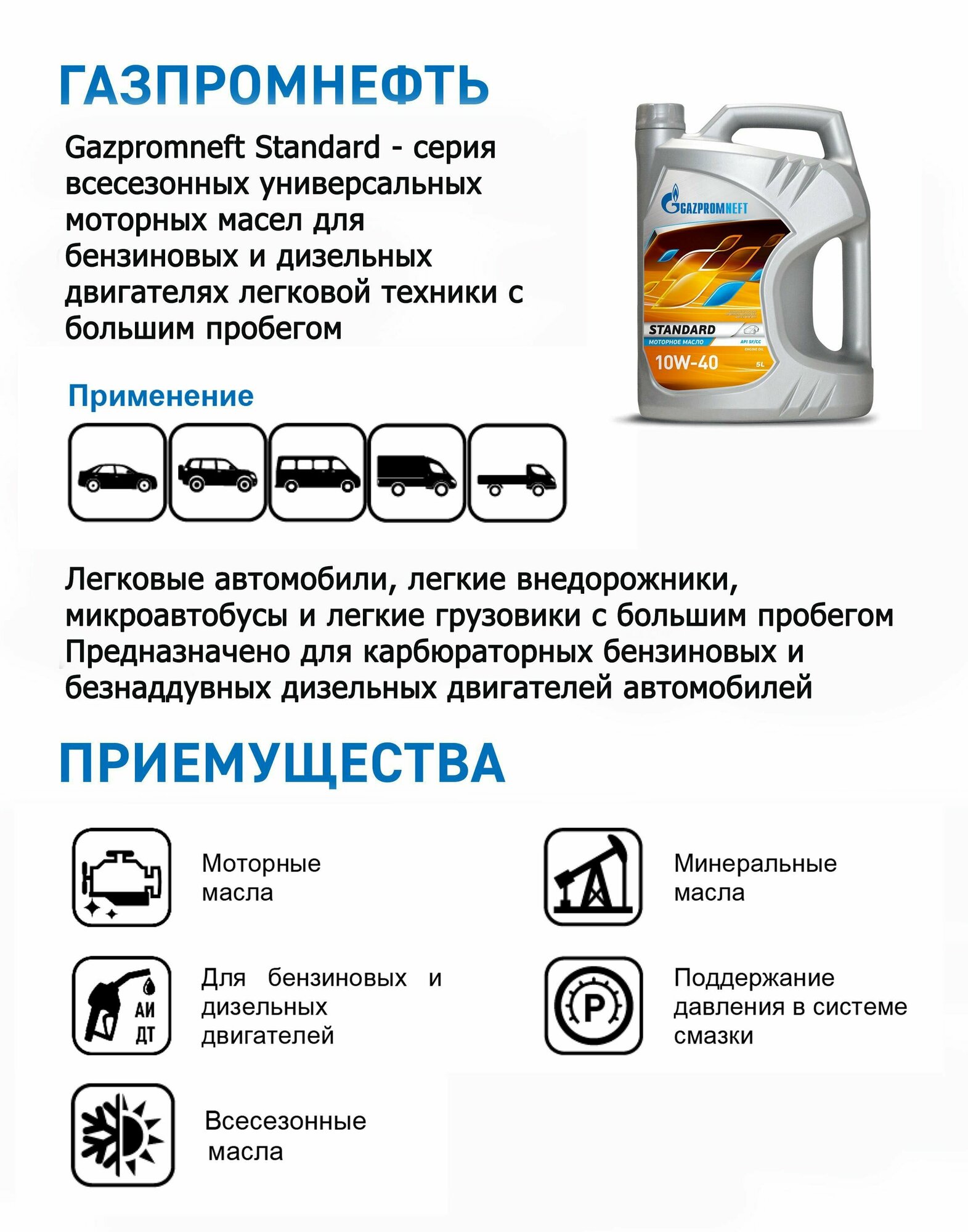Ниже Вы можете прочитать отзывы на Масло Gazpromneft Standard 10W-40 5л, ознакомится с подробными характеристиками, посмотреть интересные обзоры и фотографии на Масло Gazpromneft Standard 10W-40 5л.