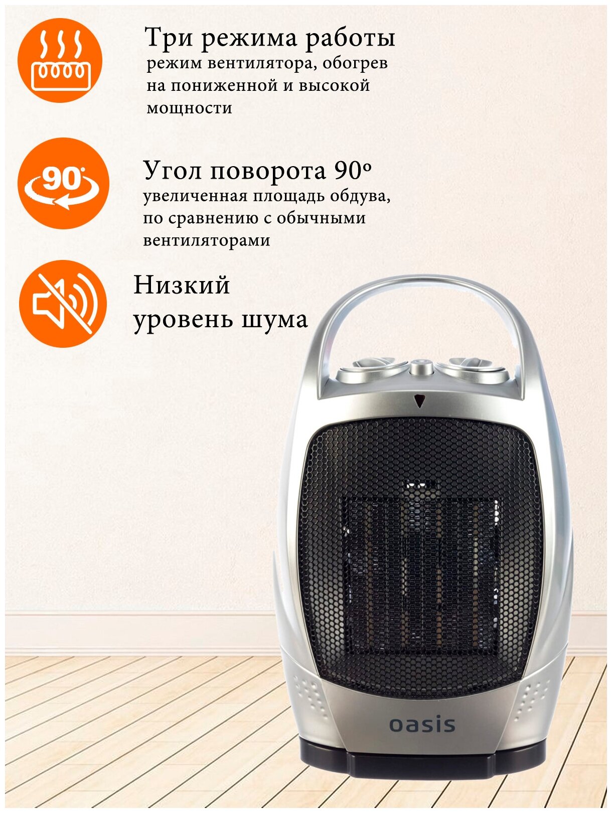 Тепловентилятор Oasis KS-15RP, керамический, с поворотом, 1500 Вт, серебристый