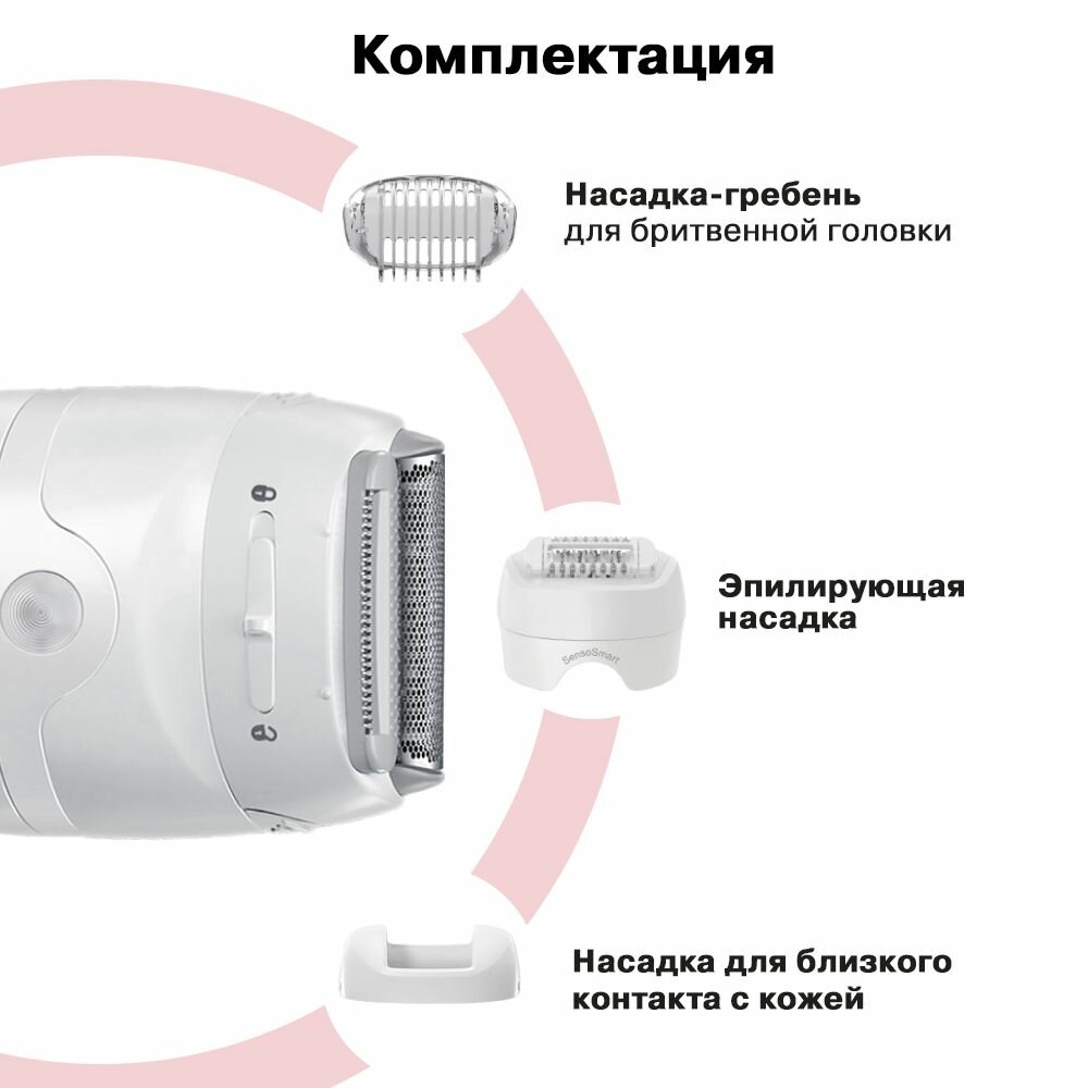 | Подробная комплектация | эпилятор, чехол, насадки: бритвенная, насадка-гребень, для массажа, насадка для эффективной эпиляции |