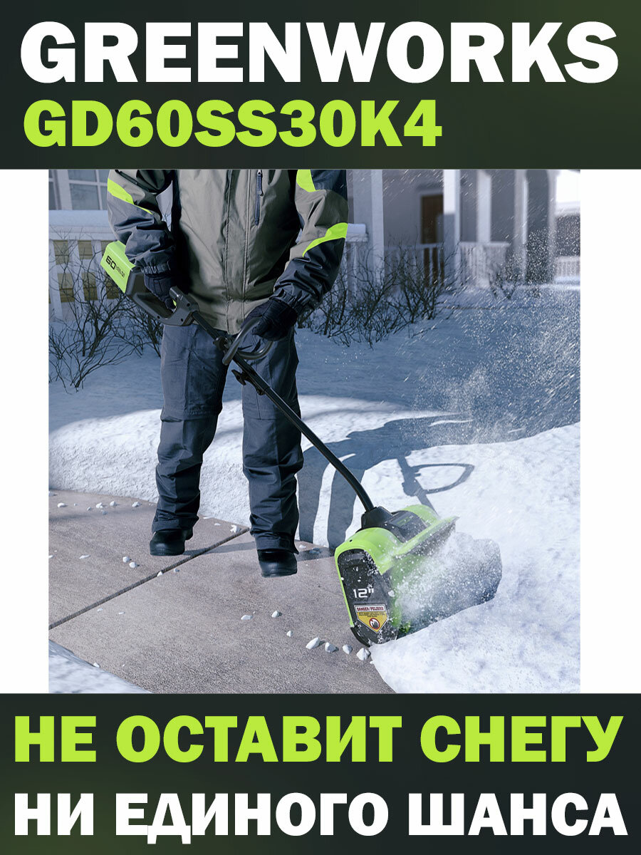 Снегоуборщик аккумуляторный Greenworks GD60SS, 60V, 30 см, бесщеточный, с АКБ 4 А. ч и ЗУ