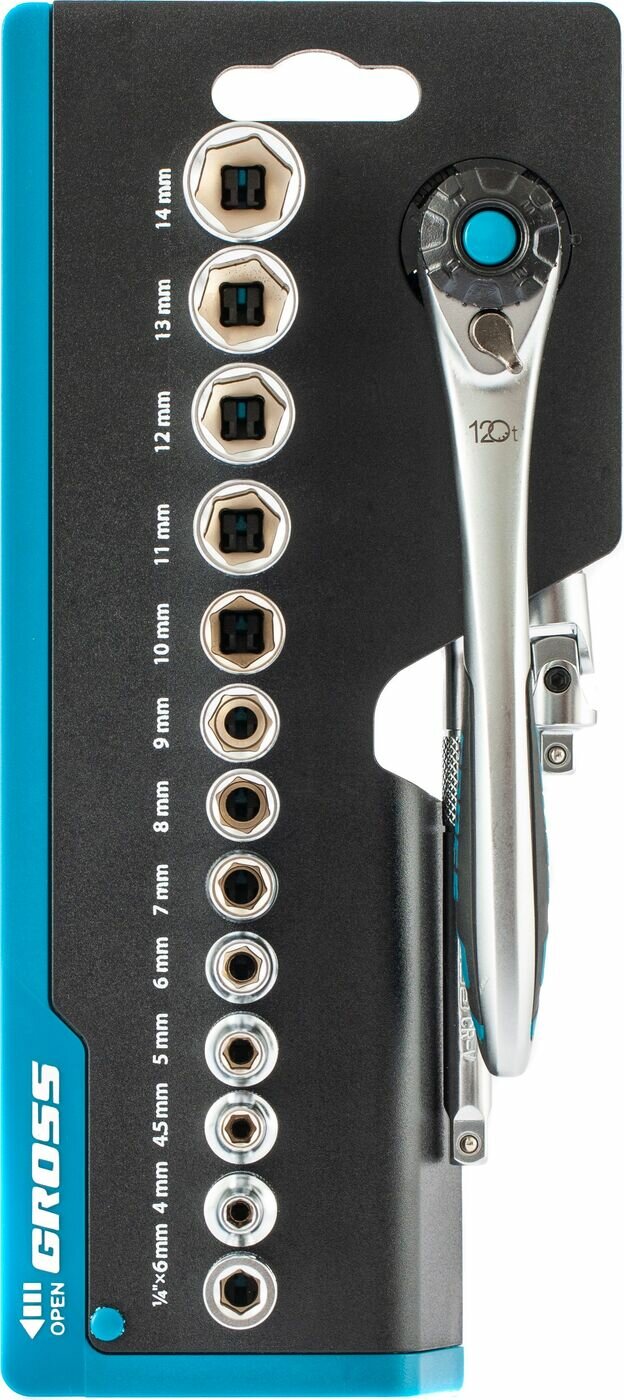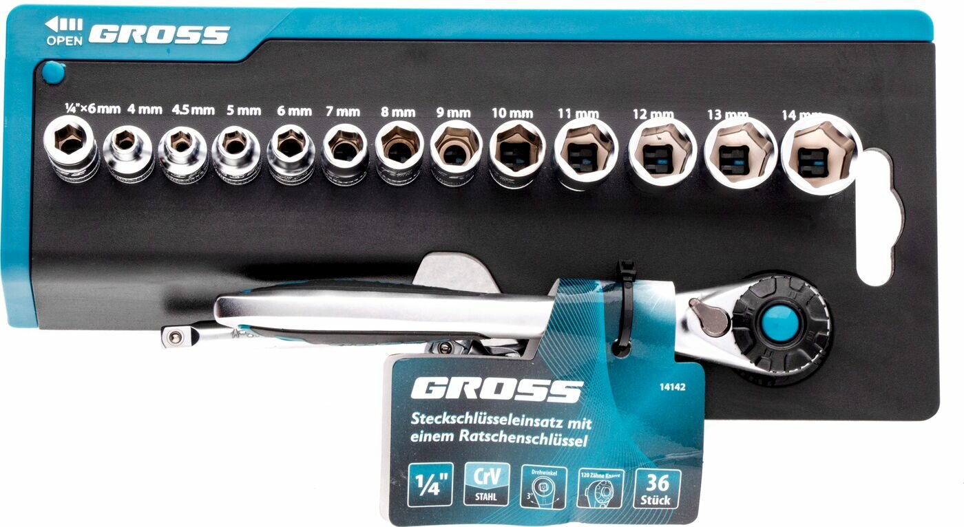 Набор торцевых головок Gross трещотка 120 зубьев, 1/4", CrV, 36 предметов 14142