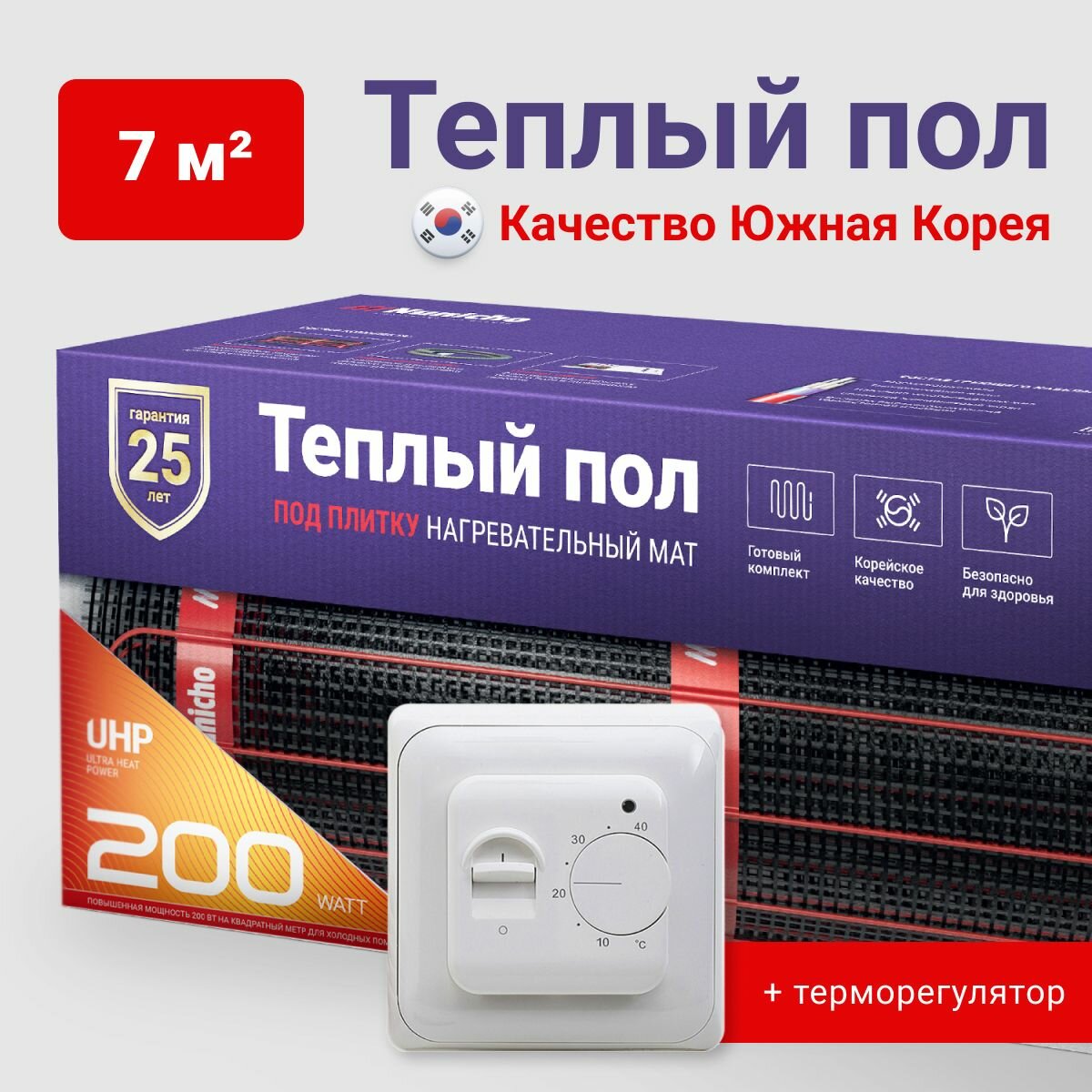 Теплый пол под плитку в стяжку NUNICHO 7 м2, 200 Вт/м2 с механическим белым терморегулятором электрический нагревательный мат