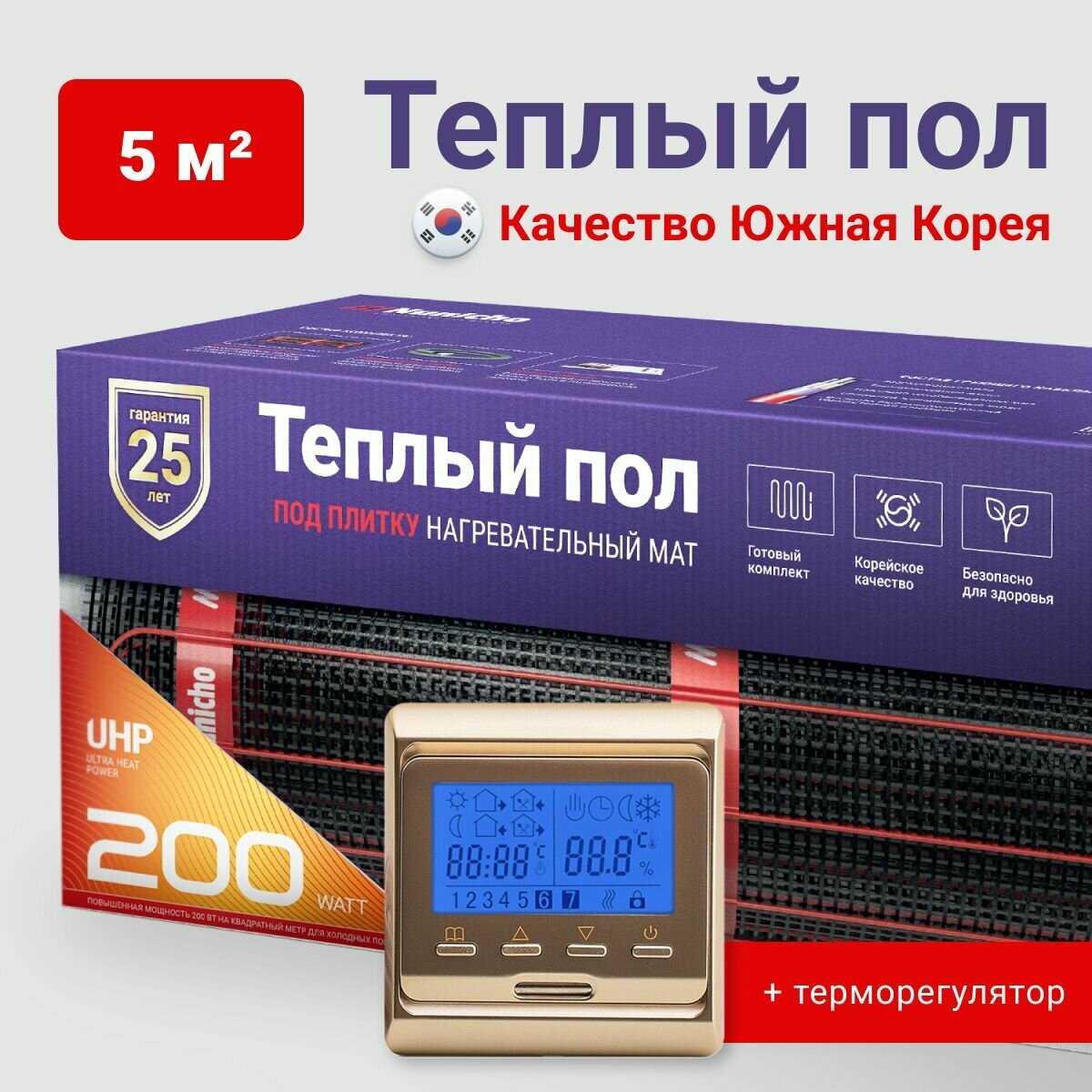 Теплый пол электрический под плитку 1 м2 Nunicho 200 Вт/м2 с терморегулятором программируемым золотистым, нагревательный мат пр-во Южная Корея