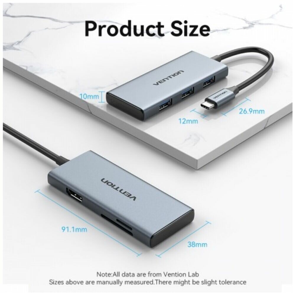 Vention Мультифункциональная док-станция 6 в 1, Type C/USB 3.0 + HDMI + SD + TF для ноутбука, телефона, шнур 15 см, арт. TOOHB