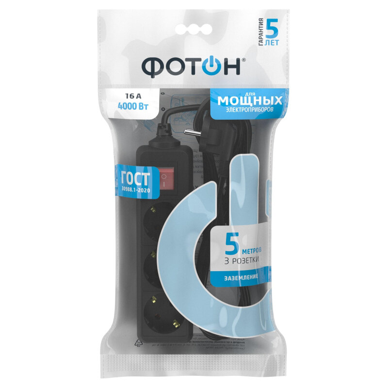 Удлинитель сетевой для розетки фотон 16А 5 метров 3 розетки с выключателем с заземлением черный, ГОСТ