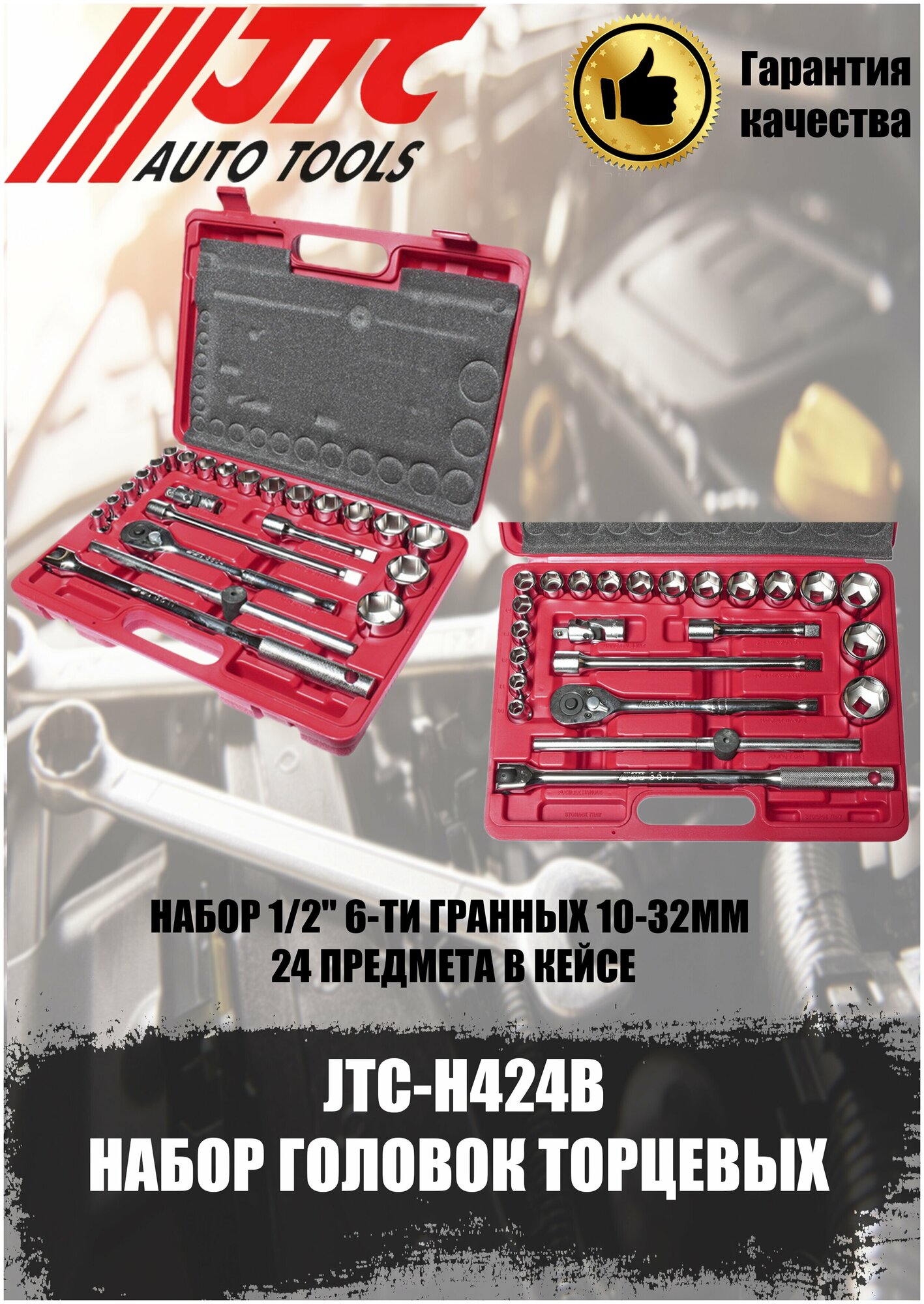JTC-H424B JTC Набор головок торцевых 1/2" 6-ти гранных 10-32мм (в кейсе) 24 предмета