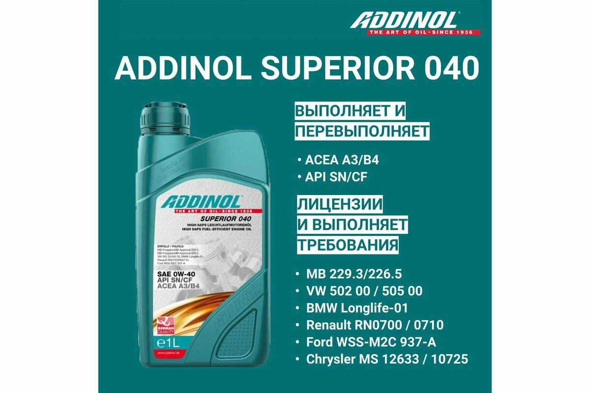 Ниже Вы можете прочитать отзывы на Addinol Superior 040 0W-40 1л., ознакомится с подробными характеристиками, посмотреть интересные обзоры и фотографии на Addinol Superior 040 0W-40 1л..