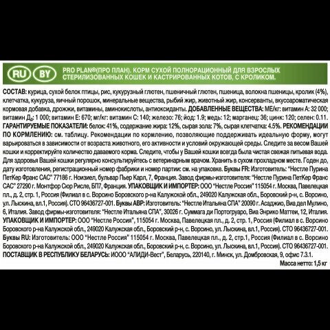 Купить Pro Plan корм для взрослых стерилизованных кошек всех пород, кролик 1,5 кг