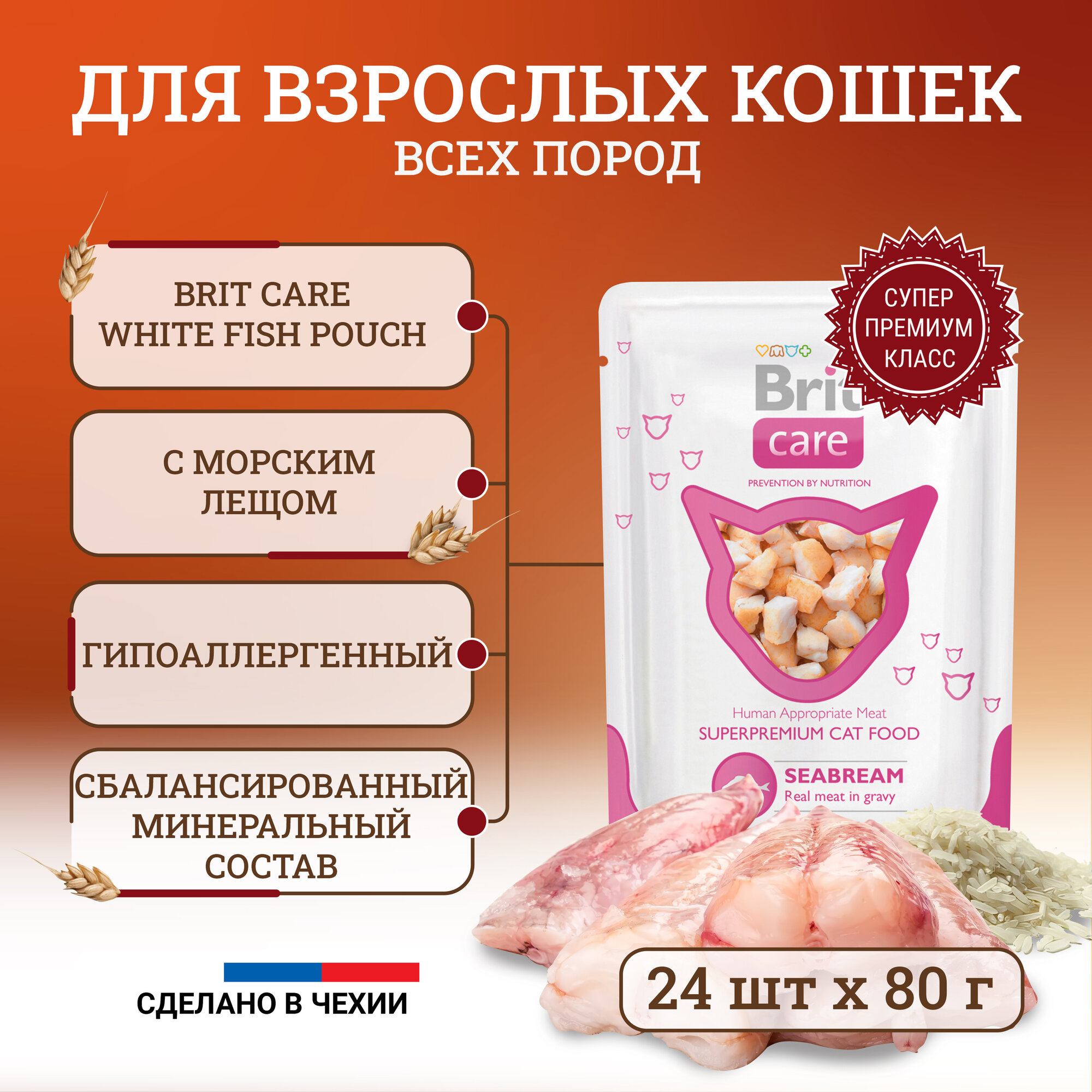 Пауч Brit Care White Fish Pouch влажный корм для кошек с морским лещом 80г, 4шт