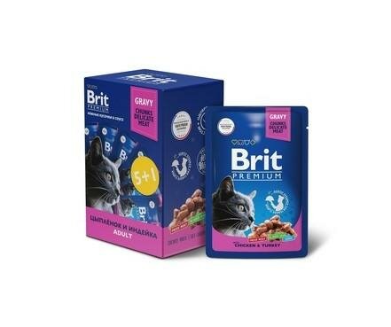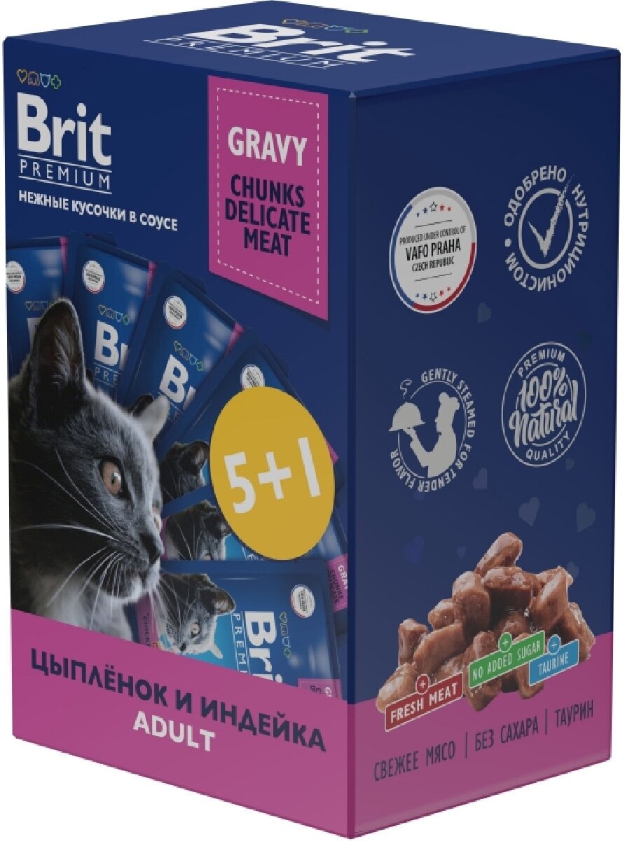 Купить Brit Premium набор паучей для взрослых кошек с цыпленком и индейкой кусочки в соусе - 85 г х 5+1 шт