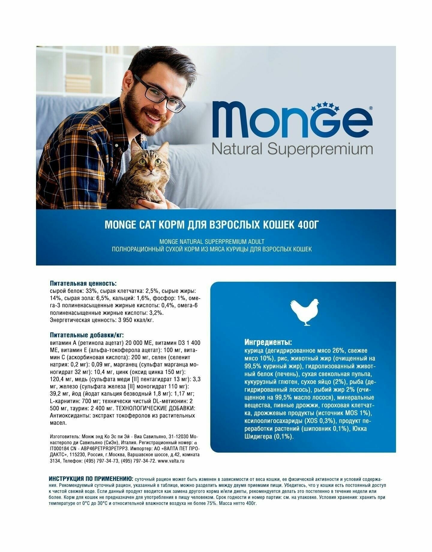Сухой корм для взрослых кошек и котов Monge Natural Superpremium, с курицей 400 г