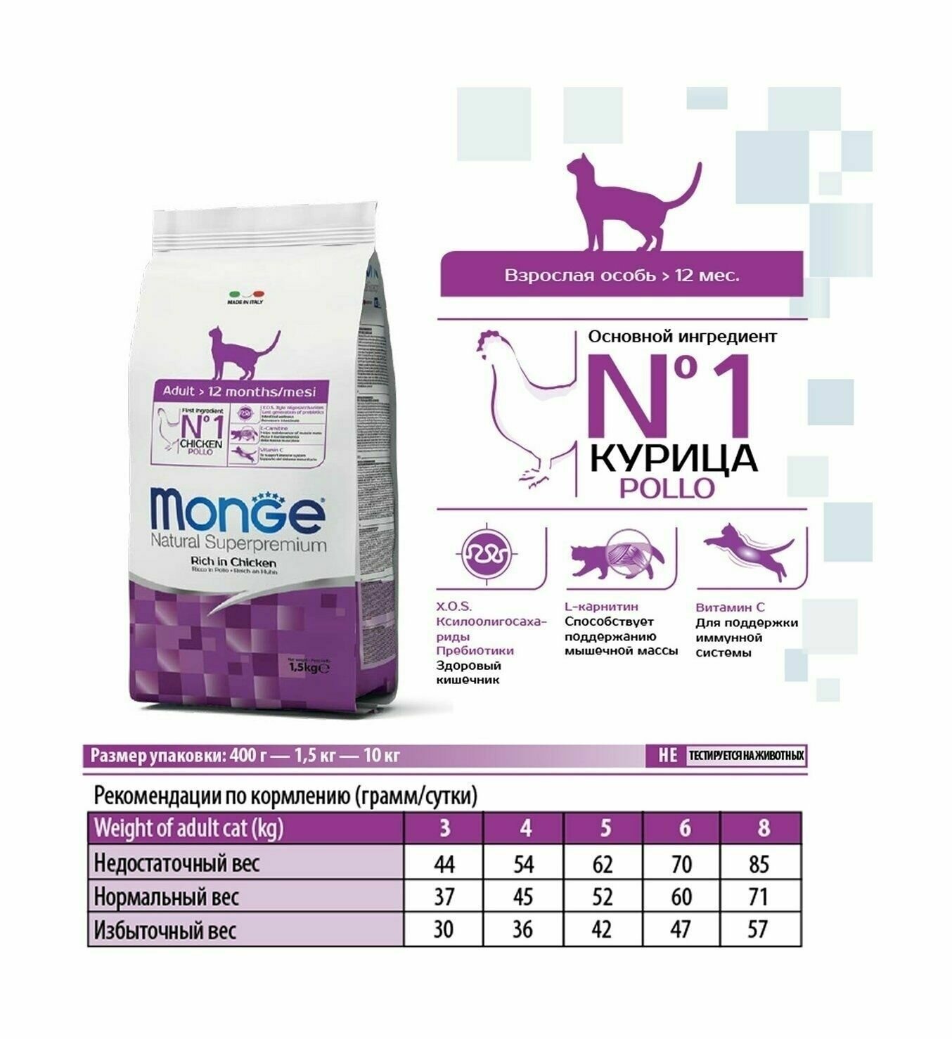 Ниже Вы можете прочитать отзывы на Сухой корм для кошек Monge Natural Superpremium, с курицей 1.5 кг, ознакомится с подробными характеристиками, посмотреть интересные обзоры и фотографии на Сухой корм для кошек Monge Natural Superpremium, с курицей 1.5 кг.