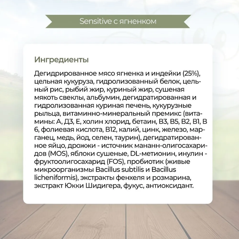 | Состав | дегидрированное мясо ягненка и курицы, цельная кукуруза, рис, гидролизованный белок, сушеная мякоть свеклы, дегидраторованная и гидролизованная куриная печень, рыбий и куриный жир, кукурузные рыльца, дегидратированное яйцо, дрожжи - источник мананн-олигосахаридов (MOS), яблоко сушеное, регулятор кислотности, антиоксиданты (витамин Е и экстракт розмарина), метионин, инулин - фруктоолигосахарид (FOS), пробиотик - живые микроорганизмы Bacillus subtilis и Bacillus licheniformis, фенхель, юкка Шидигера, фукус, витамины и минералы |