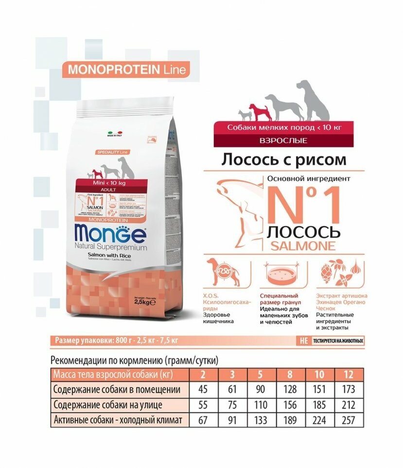 Monge Сухой монопротеиновый корм для взрослых собак мелких пород лосось, рис 2,5 кг / Монж Монже Dog Speciality Line Monoprotein Mini Adult Salmon, Rice