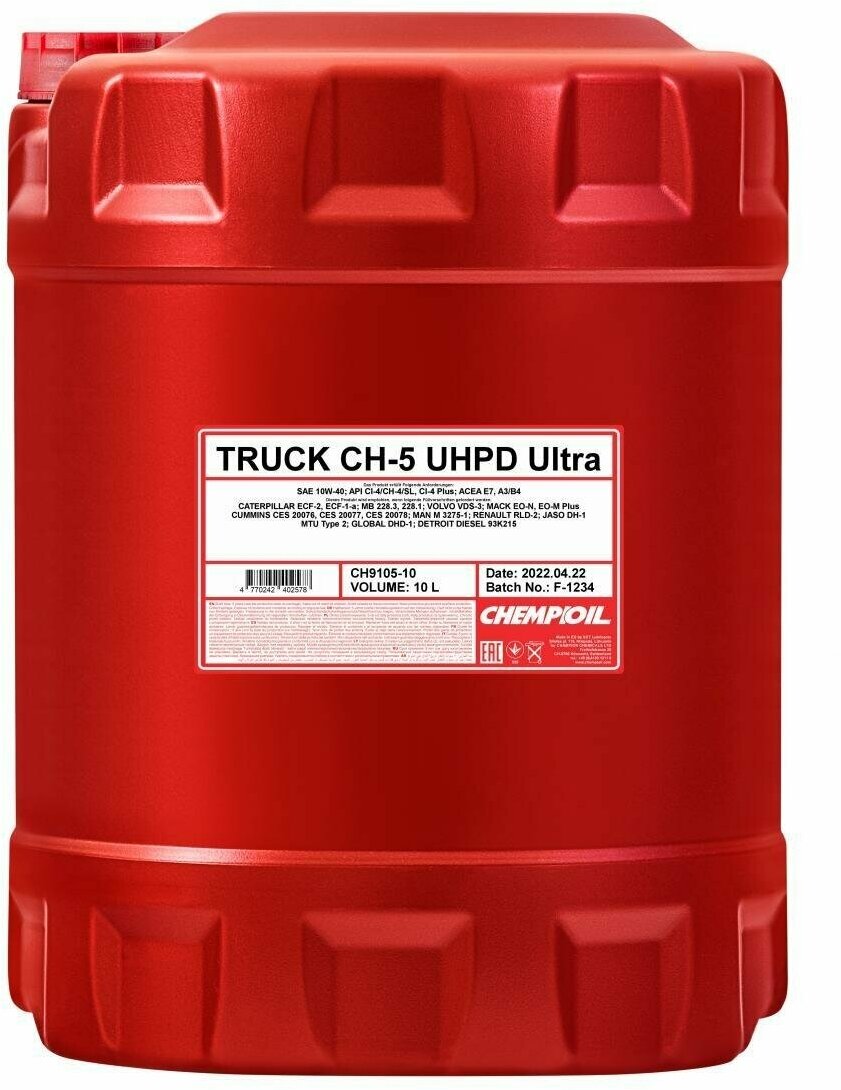 Купить CHEMPIOIL Масло Chempioil Truck Ultra Uhpd Ch-5 Sae 10W-40 П/Синт. (10 Л) Api Ci-4/Ch-4/Cg-4/Cf-4/Sl; Acea E7/A3/B4; Mb 228....