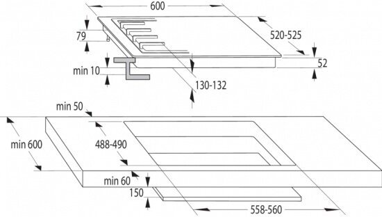 | Размеры конфорок | передняя в центре: нормальная 7.35 см, задняя в центре: малая 5.37 см, левая: 12.3 см, правая: нормальная 7.35 см |