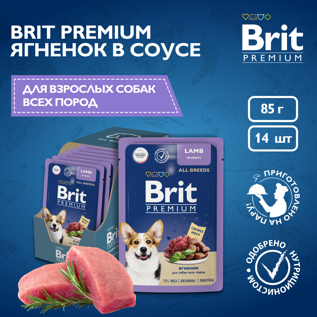 Влажный корм для собак. Пауч для взрослых собак всех пород, Ягнёнок в соусе, 85гр, 14 шт BRIT PREMIUM