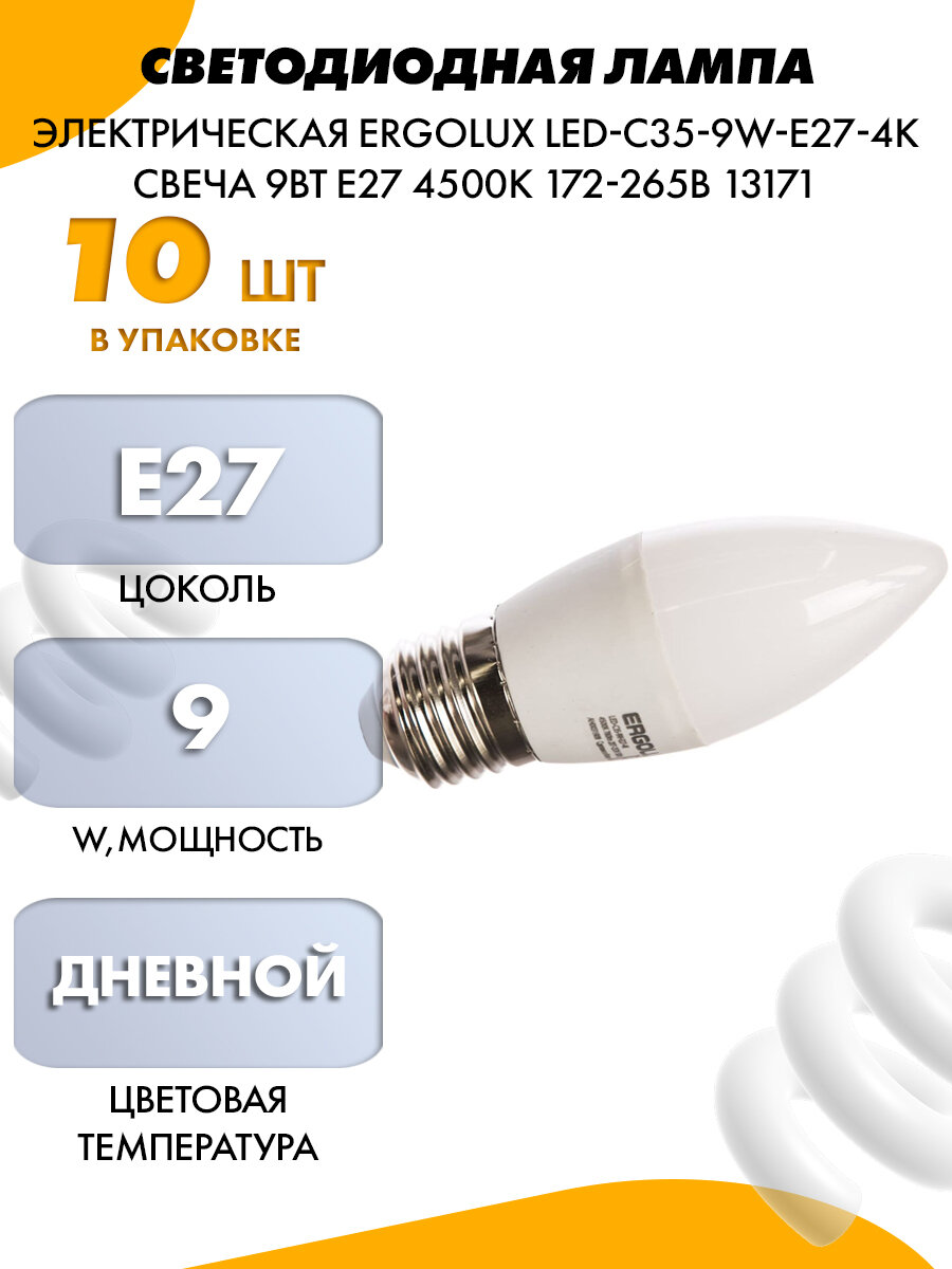 Лампочка светодиодная C35 Ergolux, 9Вт 220В, цоколь Е27, нейтральный свет 4500К, 1 шт.