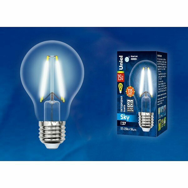 СохранитьЛампа светодиодная филаментная (UL-00005850) Uniel E27 15W 4000K прозрачная LED-A60-15W/4000K/E27/CL PLS02WH интересное: