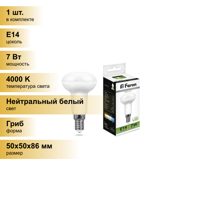 Лампа светодиодная LED зеркальная 7вт Е14 R50 белый (LB-450) | код 25514 | FERON (5шт.в упак.)