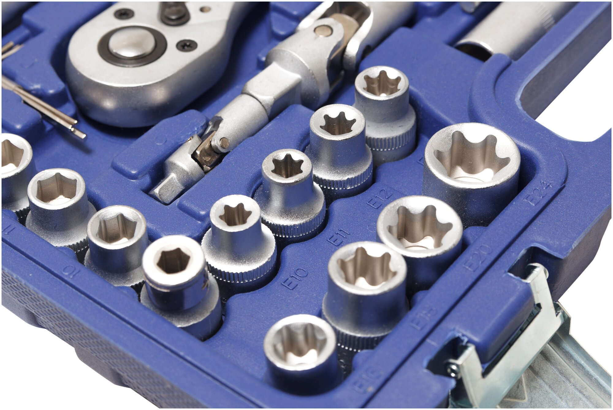 | Головки торцевые подробно | 1/4": 4, 4.5, 5, 5.5, 6, 7, 8, 9, 10, 11, 12, 13, 14 мм; длинные 1/4": 6, 7, 8, 9, 10, 11, 12, 13 мм; Torx 1/4": E4, E5, E6, E7, E8; трещотка 1/4": 24 зуба; удлинитель 1/4": 50, 100 мм; карданный шарнир 1/4"; с битами 1/4": SL4, SL5.5, SL6.5, PH1, PH2, PZ1, PZ2, T8, T10, T15, T20, T25, T27, T30, H3, H4, H5, H6; 1/2": 10, 11, 12, 13, 14, 15, 16, 17, 18, 19, 20, 21, 22, 24, 27, 30, 32 мм; длинные 1/2": 14, 15, 17, 19, 22 мм; Torx 1/2": E10, E11, E12, E14, E16, E18, E20, E24; трещотка 1/2": 24 зуба; удлинитель 1/2": 125, 250 мм; карданный шарнир 1/2"; свечные 1/2": 16, 20.6 мм |