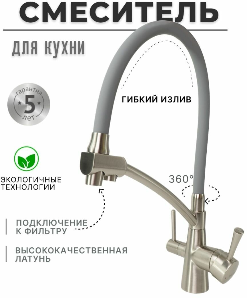 Смеситель для кухни с гибким изливом и встроенным краном под фильтр питьевой воды Ledeme L4855A-9 серый/суперсталь