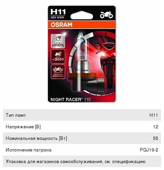 Лампа H11 12V 55W Moto Night Racer +110% Pgj19-2, Блистер 1 Шт. Osram Арт. 64211Nr1-01B Osram арт. 64211NR101B