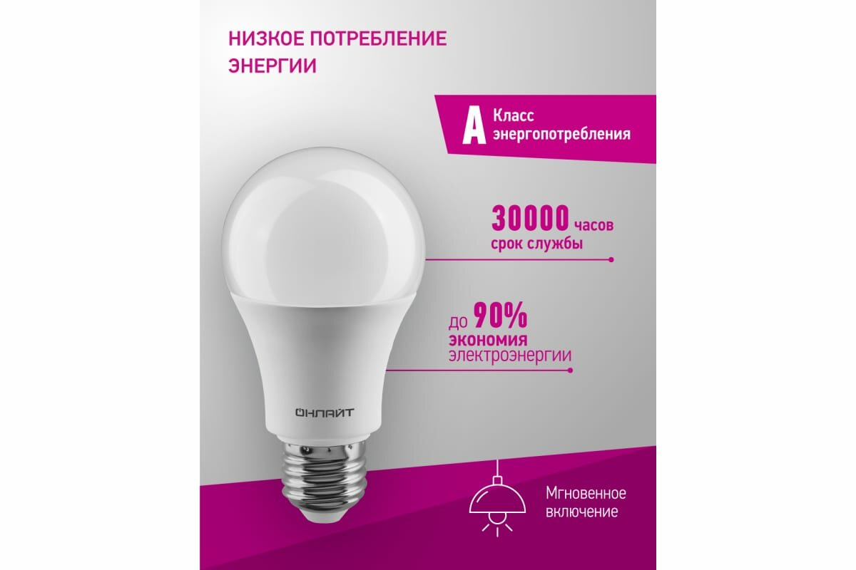 (3 шт.) Светодиодная лампочка онлайт ЛОН A60 E27 15W(1350lm) 4000K 4K 115x60 OLL-A60-15-230-4K-E27 61150 Нейтральный белый. Цоколь E27
