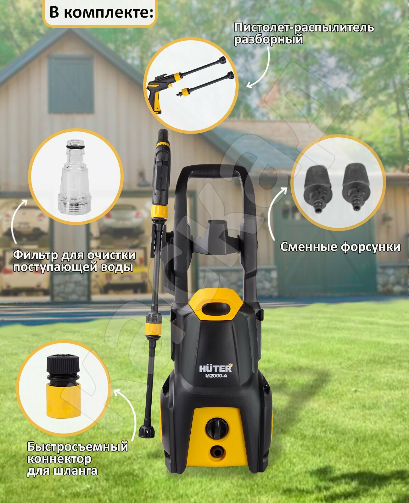 Мойка высокого давления Huter M2000-A, 1900 Вт, 165 Бар, 375 л/ч, шланг – 5 м, подача воды: водопровод/емкость
